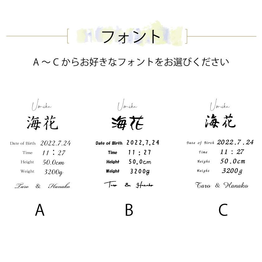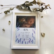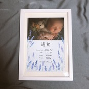 お子様のお写真、お名前、出生日時、身長、体重、お父様お母様のお名前(入れないこともできます)を入れて作成いたします。